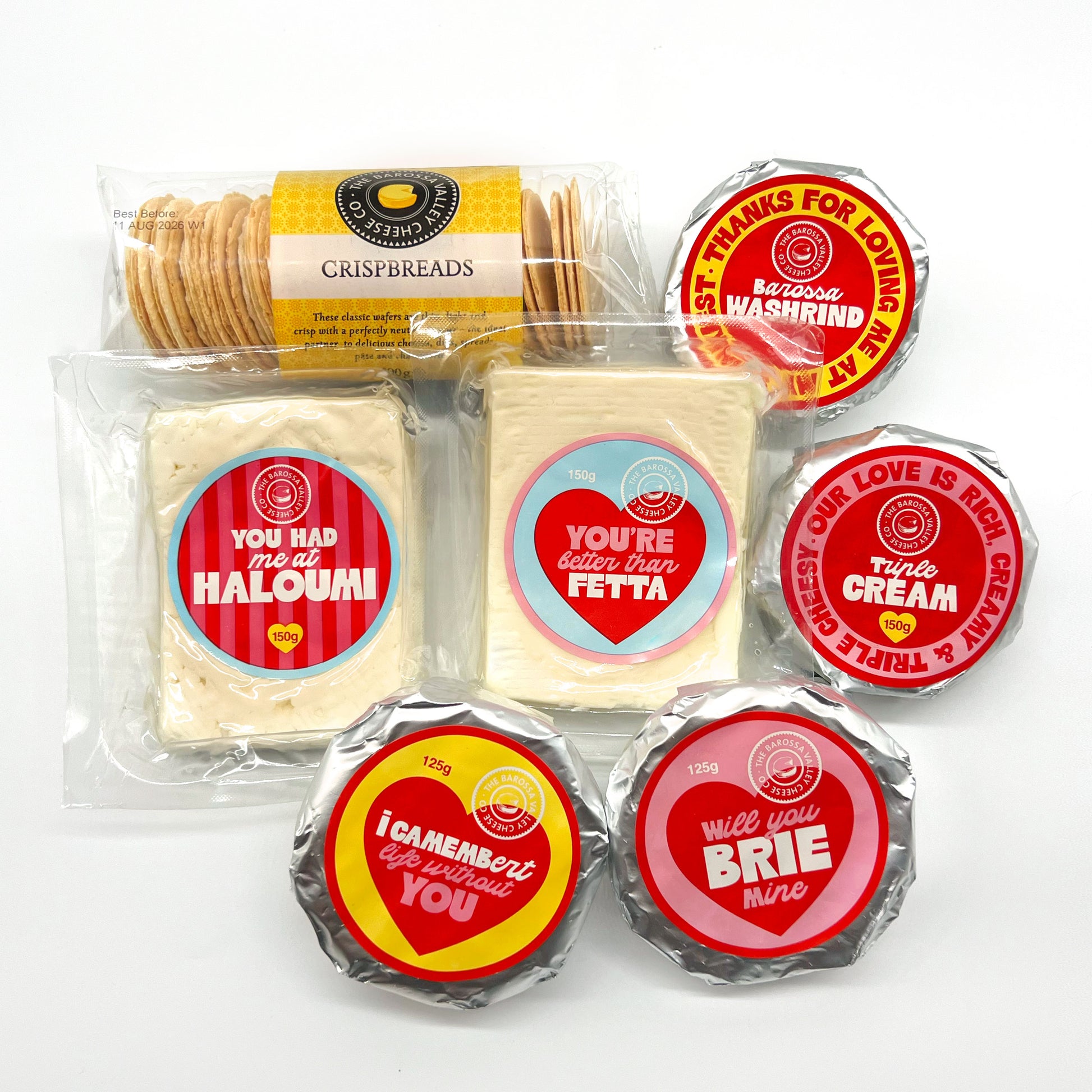 This pack includes six Barossa Valley Cheese Company cheeses, each wrapped in our limited-edition love labels, plus a pack of crispbread. Perfect for sharing, gifting, or an easy cheese board at home.